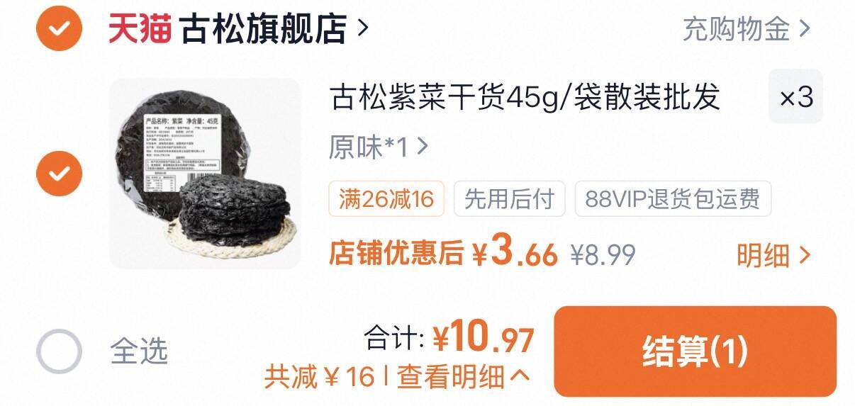 古松无沙免洗紫菜拍3件45g*3 10.9元