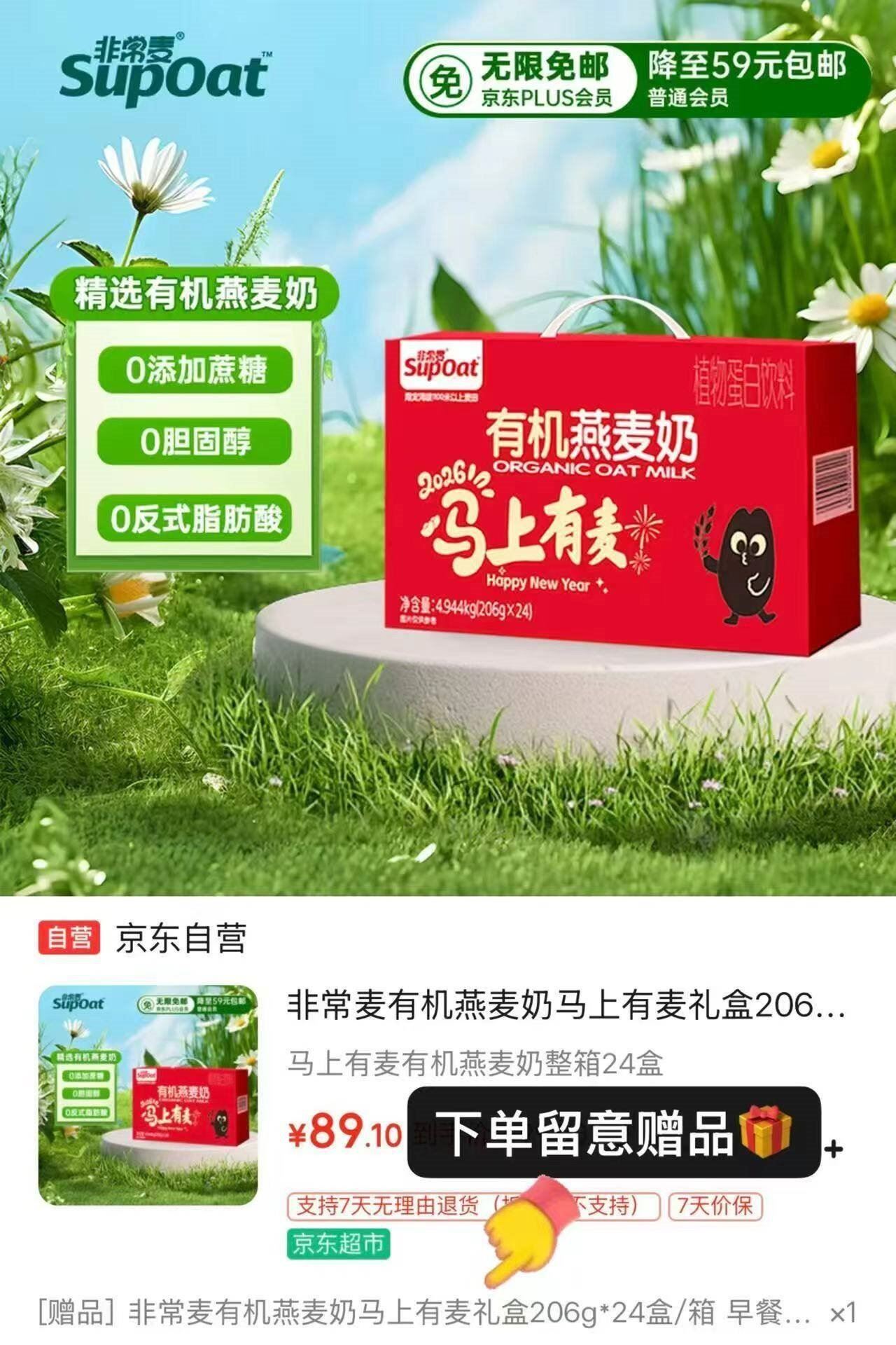 非常麦有机燕麦奶206g*24盒 赠同款1箱 89.1元