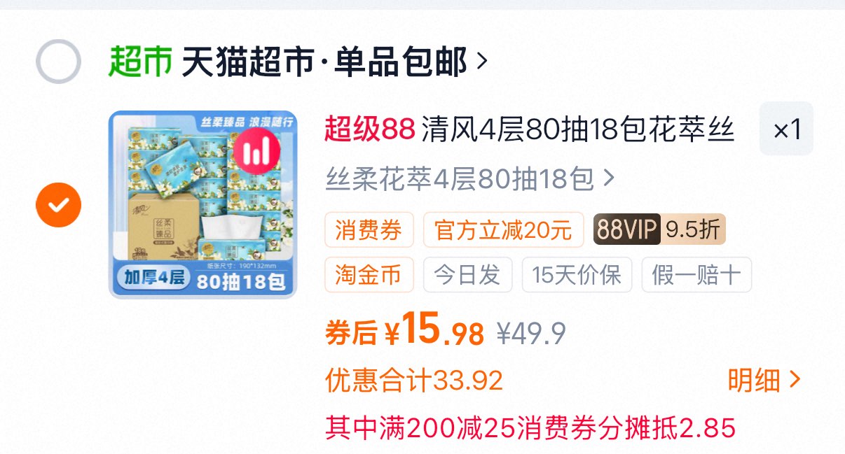 清风花萃抽纸加厚4层18包 15.98元