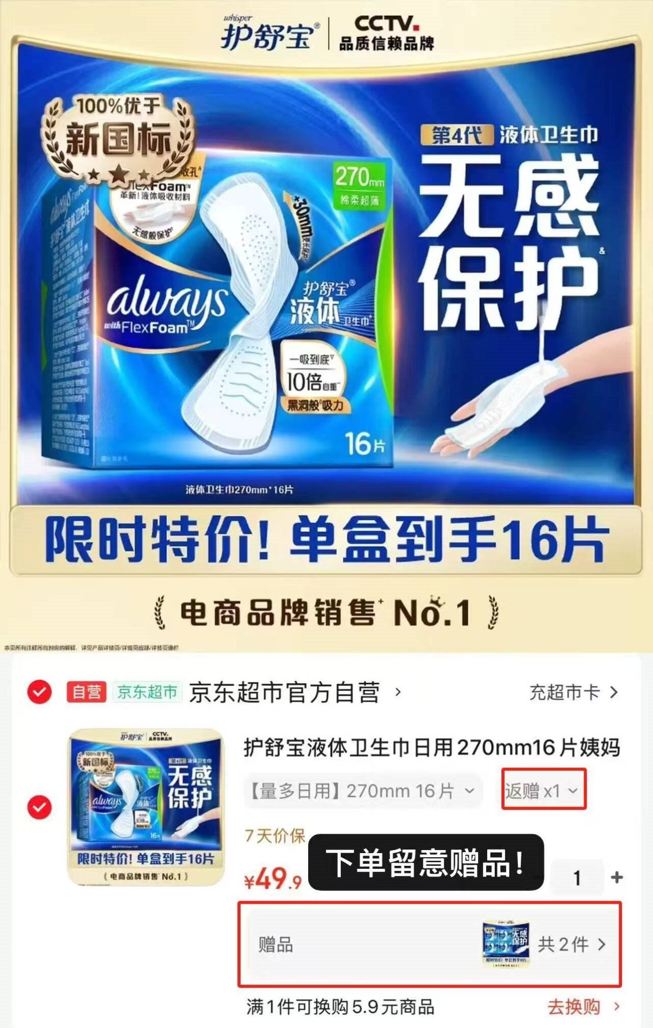 护舒宝液体卫生巾日用270mm*16片 49.9元