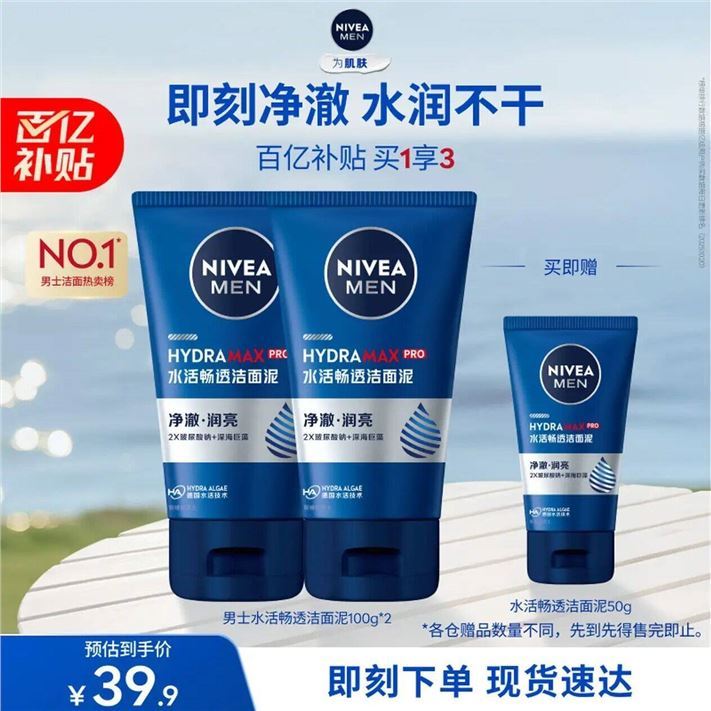 妮维雅男洗面奶100g*2支 33元,妮维雅润肤霜75ml*2盒 44元