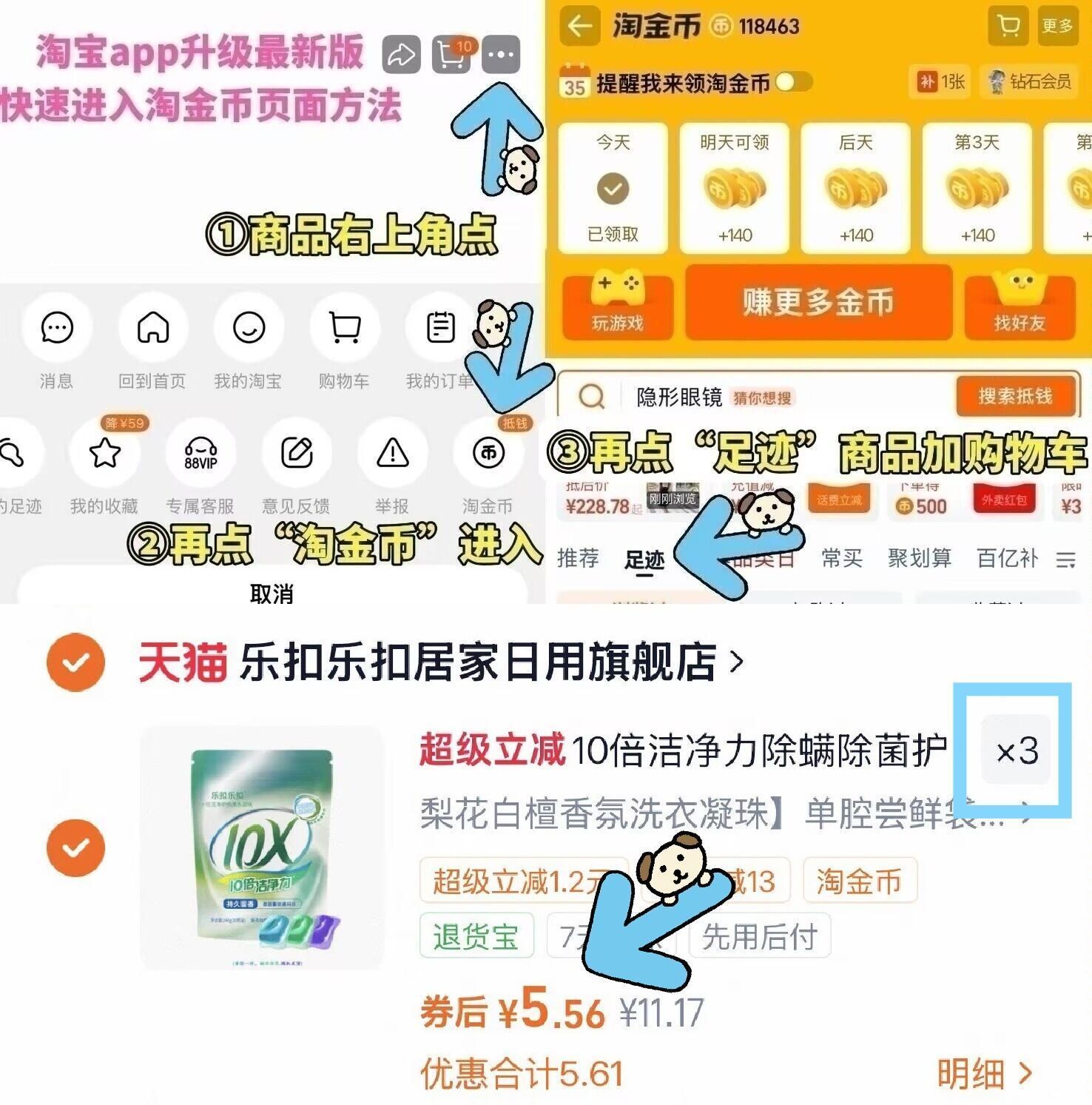 ①如图点右上角3个点选淘金币
