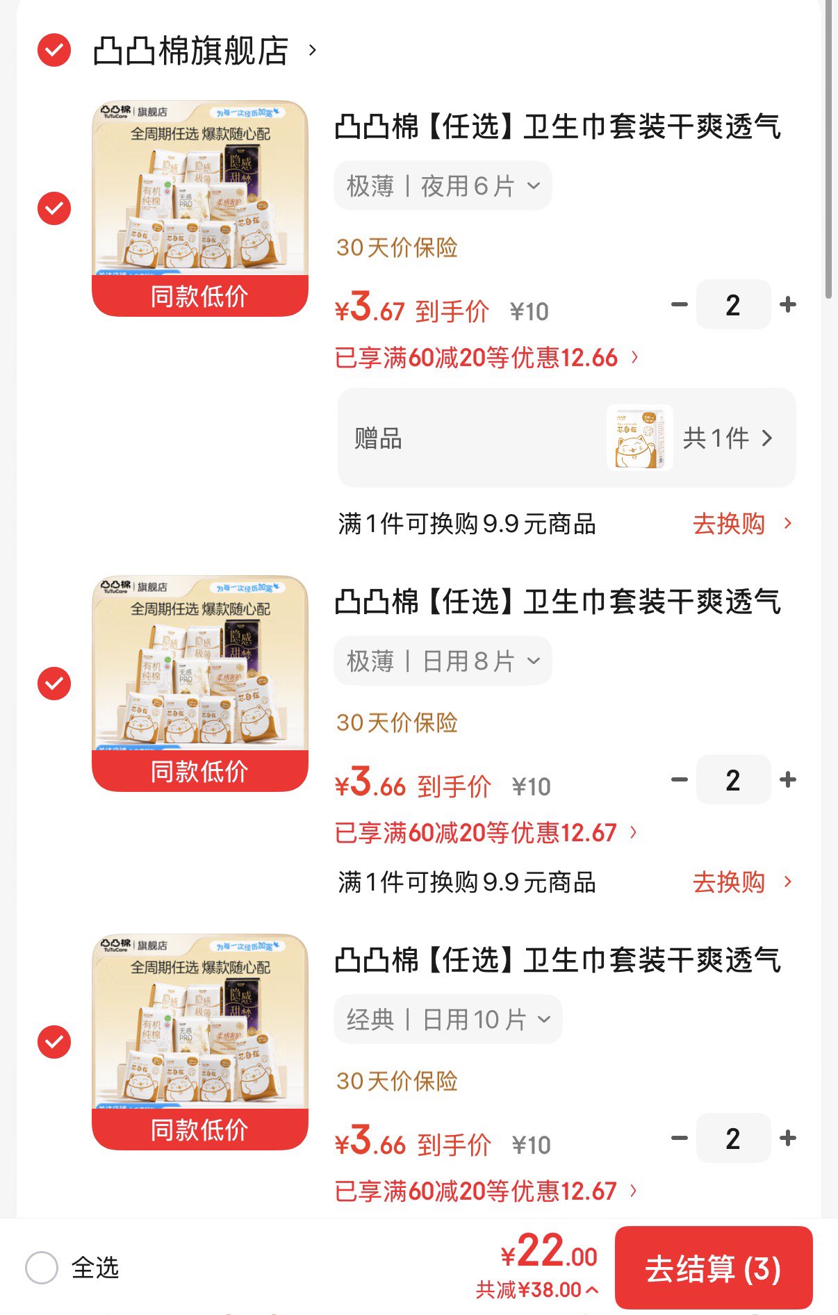 凸凸棉日用夜用卫生巾套装任选6件赠1包 22元