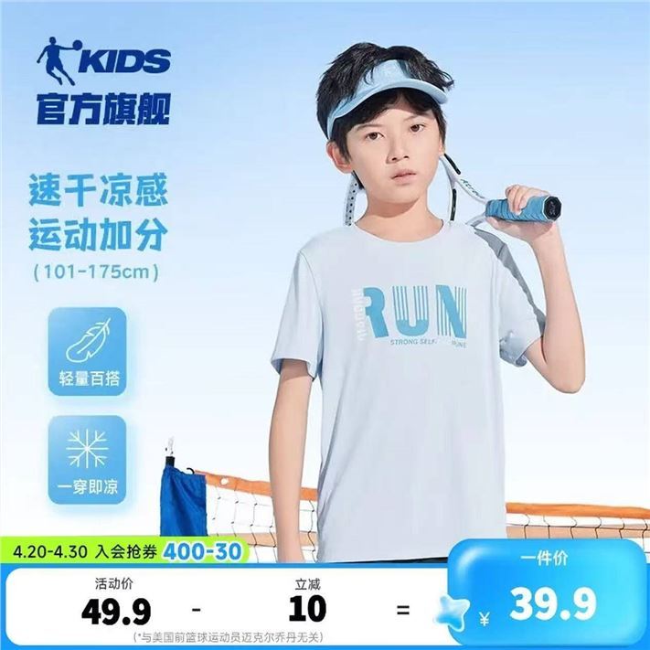乔丹男童运动速干T恤短袖 29.9元,乔丹男童运动2件套装 59.9元