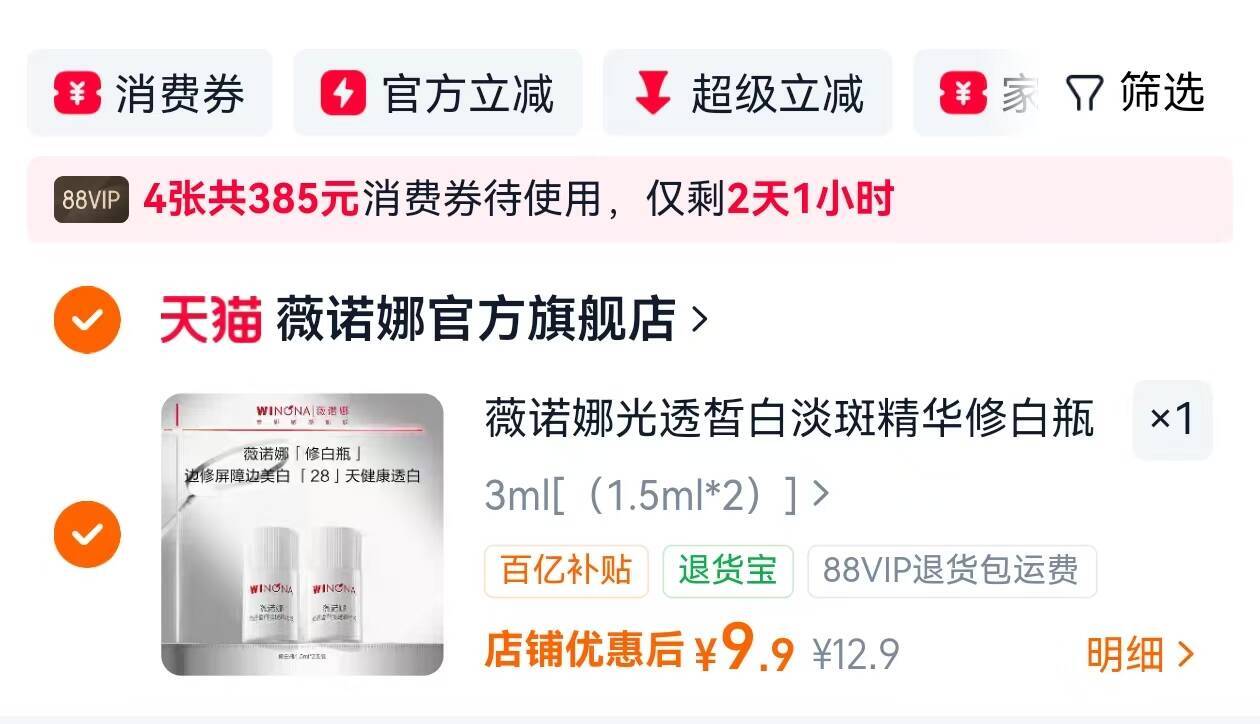 薇诺娜修白瓶精华液 1.5ml*2瓶 9.9元
