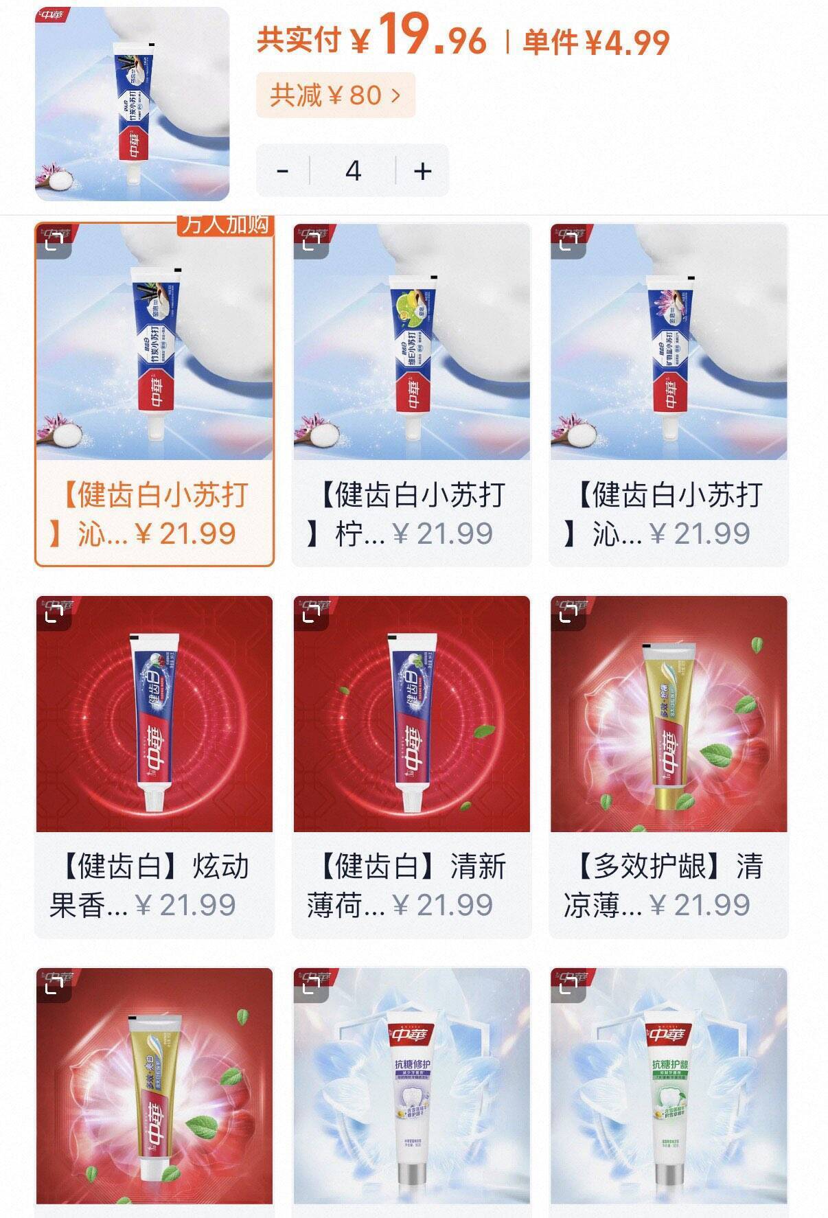 中华牙膏任选4支正装 19元