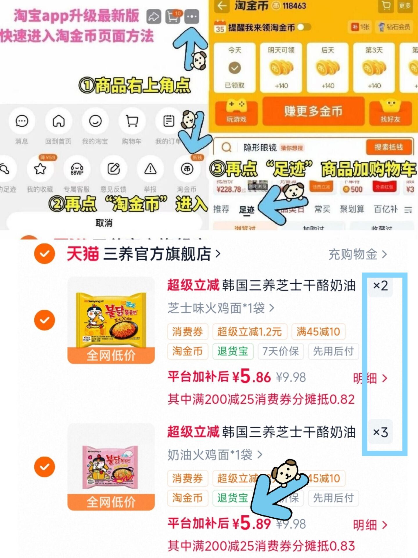 ①如图点右上角3个点选淘金币