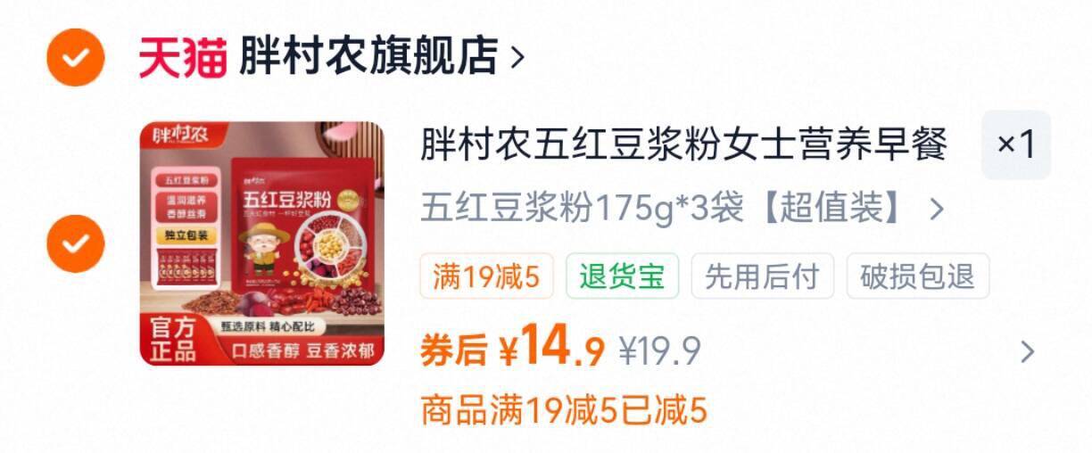 胖村农五虹豆浆粉175g*3袋 14.9元