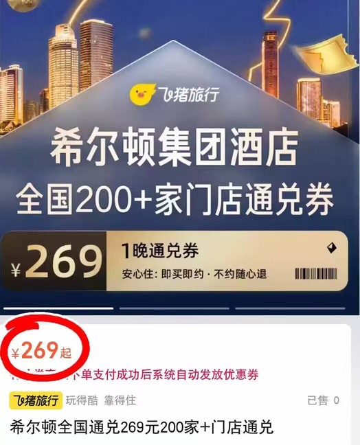 希尔顿酒店通兑券200店通兑抵扣券 269元