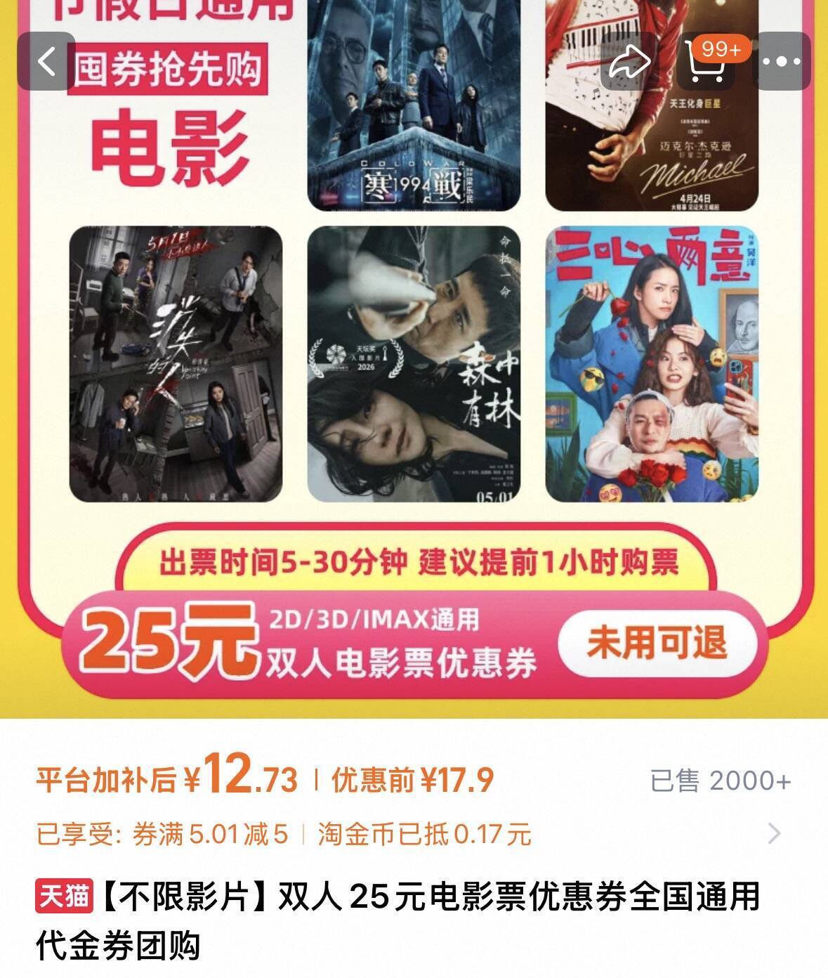 12.7元双人电影票代琻奍 代25元不限影片 节假日可用 五一假期当然要去看电影