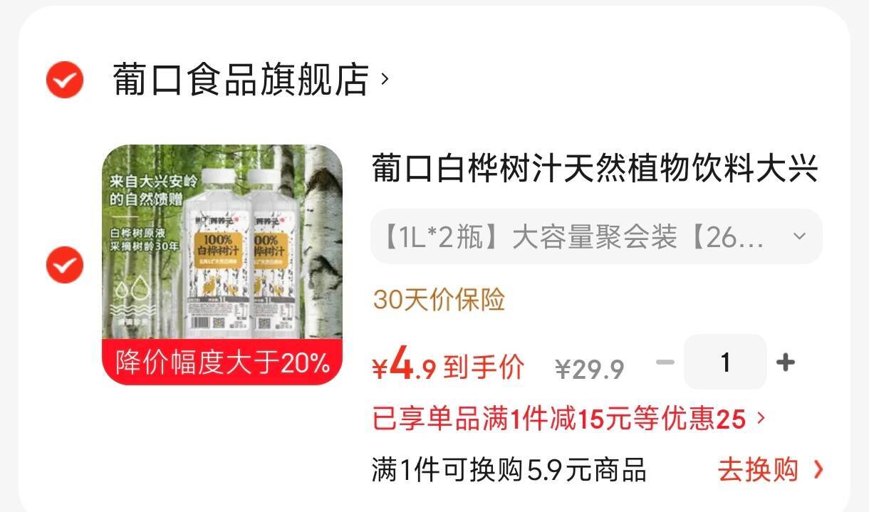 葡口白桦树汁天然植物饮料1L*2瓶 4.9元