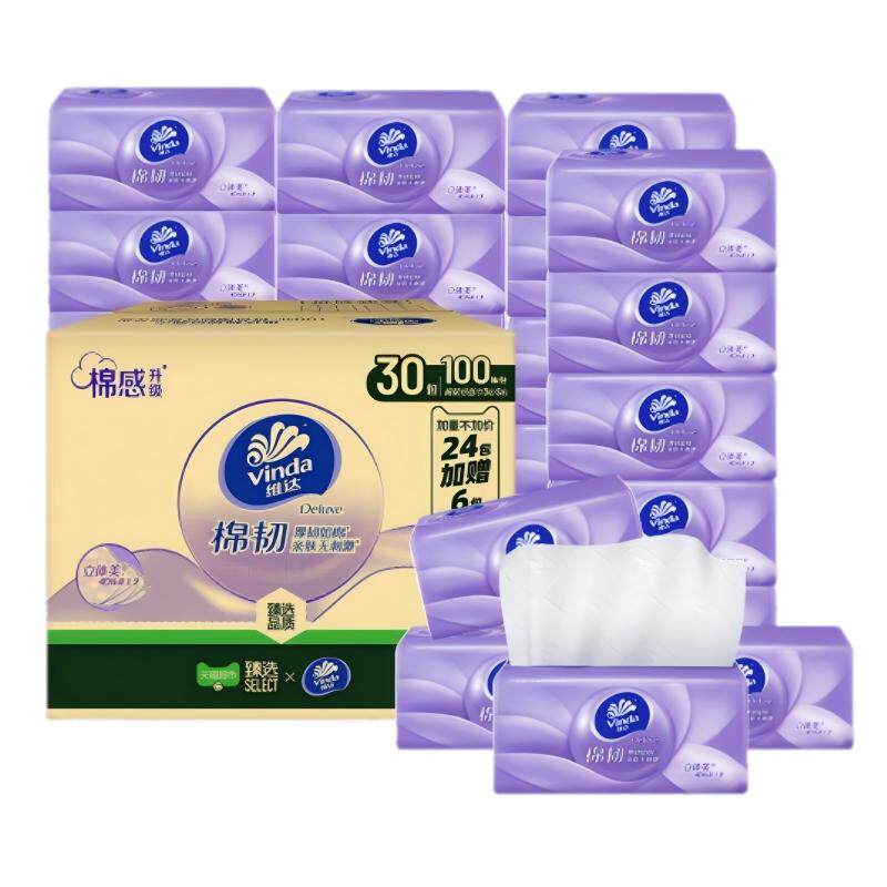 【拍3件仅127.25元!】维达棉韧抽纸100抽30包S码,8.5折+立减+95折叠加,超值优惠。4D压花工艺,亲肤无刺激,原生木浆韧性强,家用必备!