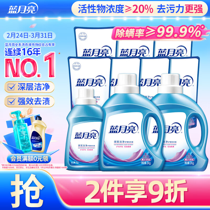 蓝月亮深层洁净洗衣液 薰衣草香 2kg*2+1kg+500g*7袋 高效除螨 强效去渍