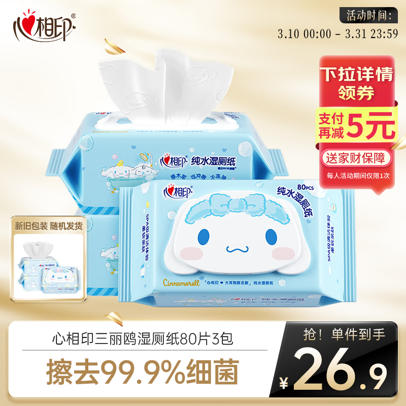 心相印京东自营旗舰店:心相印【田栩宁推荐】三丽鸥湿厕纸80片*3包 纯水湿巾 大耳狗款新旧随机 24.80元