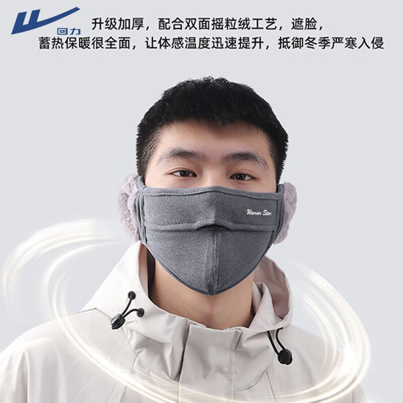 回力冬季保暖口罩男士高颜值户外防寒挡风骑行遮脸面罩加厚护耳毛绒女 浅灰色