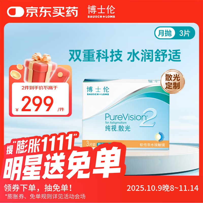 博士伦纯视2代散光定制隐形眼镜硅水凝胶月抛3片装近视透明散光片