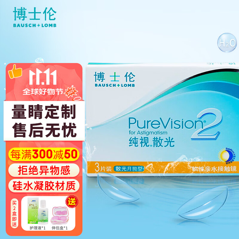 博士伦【散光定制】纯视2代近视散光隐形眼镜月抛3片 15天内发货