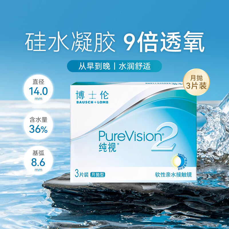 博士伦纯视2代硅水凝胶月抛3片近视隐性近视隐形眼镜透明隐形眼镜 100度
