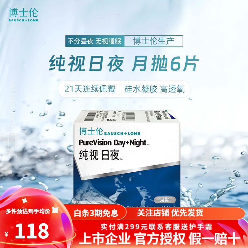 博士伦纯视日夜6片 月抛 隐形眼镜硅水凝胶连续佩戴型原装进口 纯视日夜月抛6片 850度