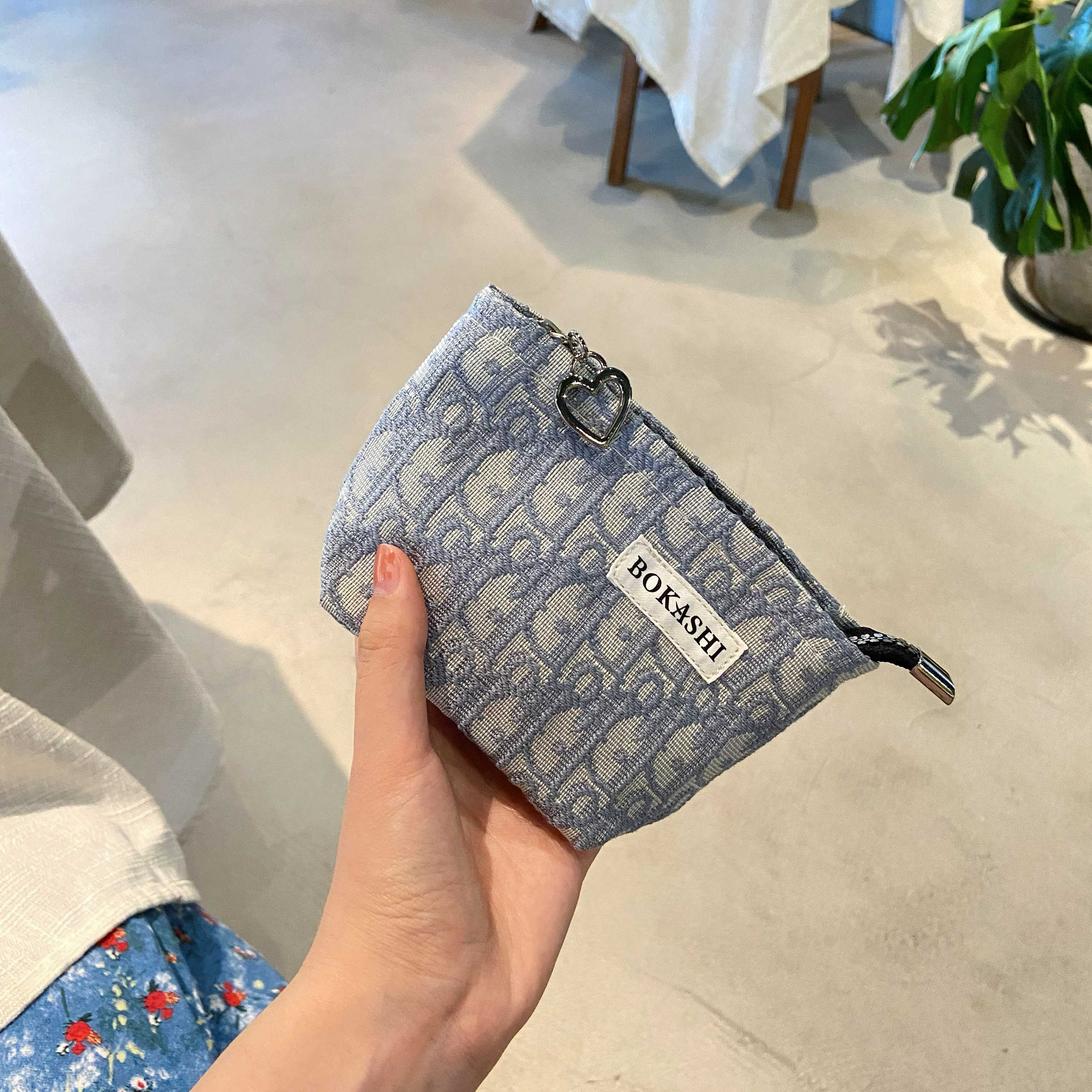 2025新款便携大容量高级感小化妆包女零钱包口红气垫收纳包手拿包 蓝色D字母-小号【爱心拉炼】