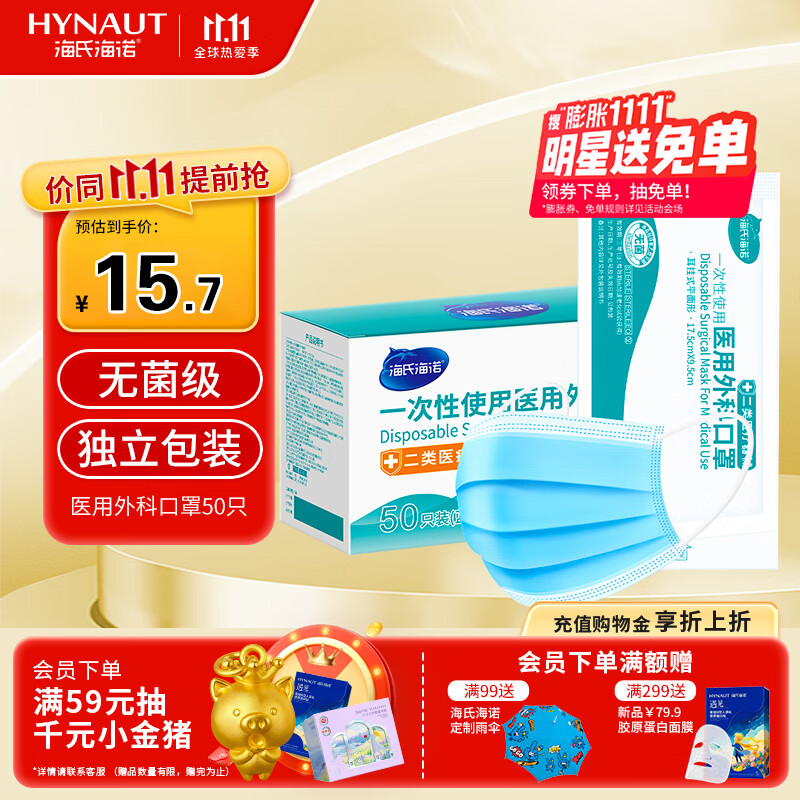 海氏海诺一次性医用外科口罩 灭菌级独立包装口罩一只一袋防尘保暖50只