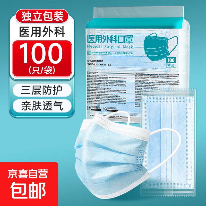 医疗三层防护官方正品成人单片独立包装 【医用外科】蓝-100只【独立包装】
