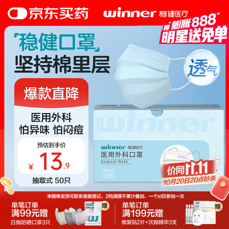 稳健 透气防细菌防尘棉里层外科口罩 50只/盒 稳健外科