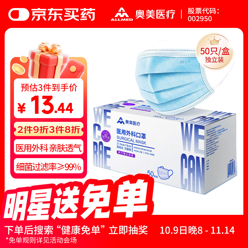 奥美医疗一次性医用外科口罩成人灭菌级独立装超薄防敏防晒口罩50只/盒
