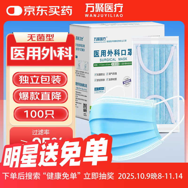 万聚医疗一次性医用外科口罩100只(独立装) 灭菌级口罩医用 防尘防细菌
