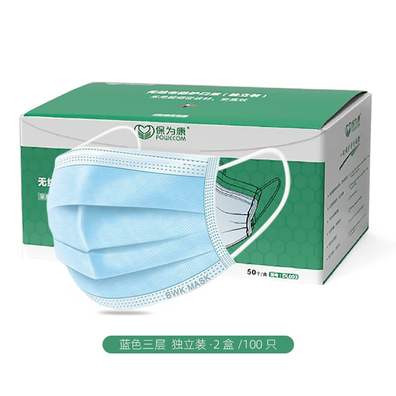 保为康一次性口罩防工业粉尘飞沫粉尘花粉含熔喷布一次性无纺布防尘三层单独包装 DL003蓝色独立包装(2盒/100只)