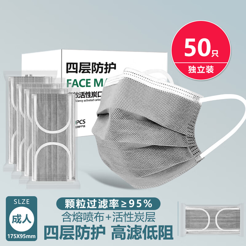实验室防毒口罩一次性单独包装活性炭防甲醛专用工业防粉尘防尘肺口罩防尘粉尘防灰防二手烟 [独立包装]灰色50只【四层活性炭高效过滤】