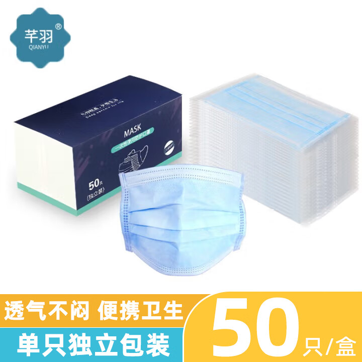 芊羽 一次性口罩三层防尘透气不勒耳朵宽带口罩成人 蓝色单独包装 50只/盒