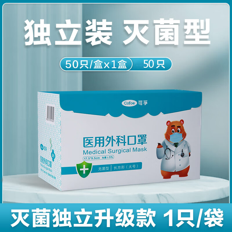 朝伊康外科口罩独立包装 一次性口罩单独单只单片 加厚甲流流感防护防尘无菌灭菌级使用 黑色每只独立装1 蓝色每只独立装50个(1盒装)