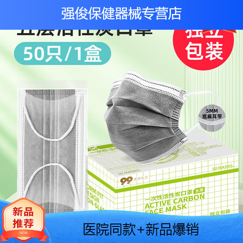通用健康活性炭口罩一次性单独包装五层加厚黑色成人防尘防甲醛二手烟 5mm宽耳带--5层加厚高效活性炭【50只 单片独 均码