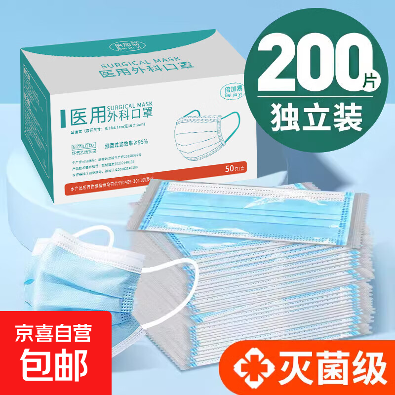 灭菌级医用外科口罩一次性医疗成人三层正品轻薄透气防尘单独包装 医用外科蓝色【200只】灭菌独立盒装