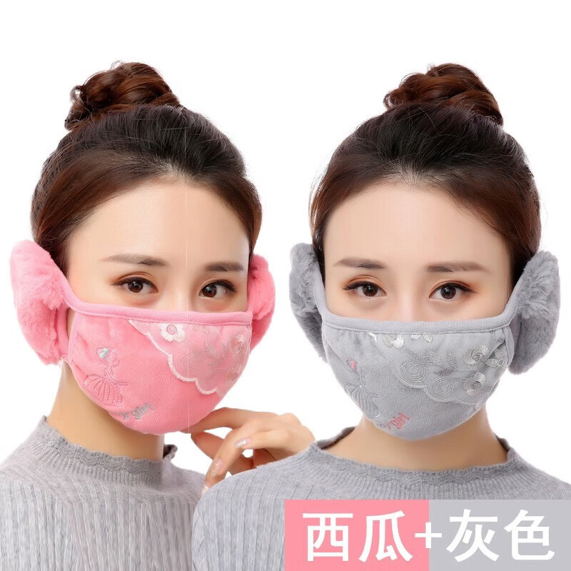 杉沓 保暖口罩女冬季户外骑行口罩防风口罩女士新款蕾丝防寒口罩护耳护脸加厚口罩 西瓜+灰色 两个装