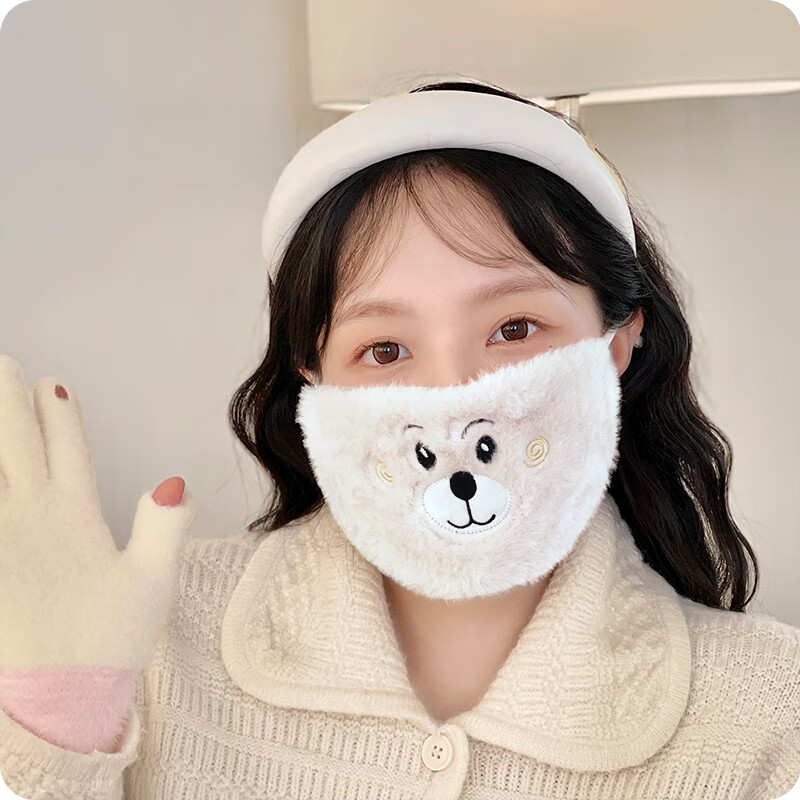 察今刺绣毛绒小熊保暖口罩冬季防寒面罩口捂骑单车冬天护嘴防风口罩女 小熊口罩【白色】