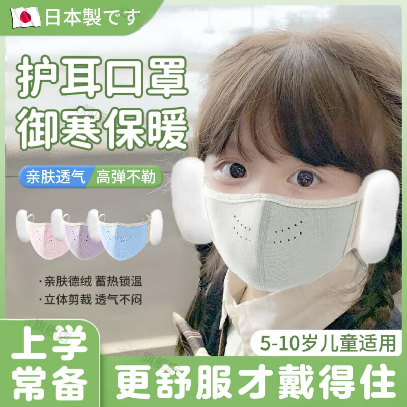 飒望日本高端护耳口罩儿童冬季秋冬天防风防寒防冻脸宝宝女男可爱口罩 青提绿
