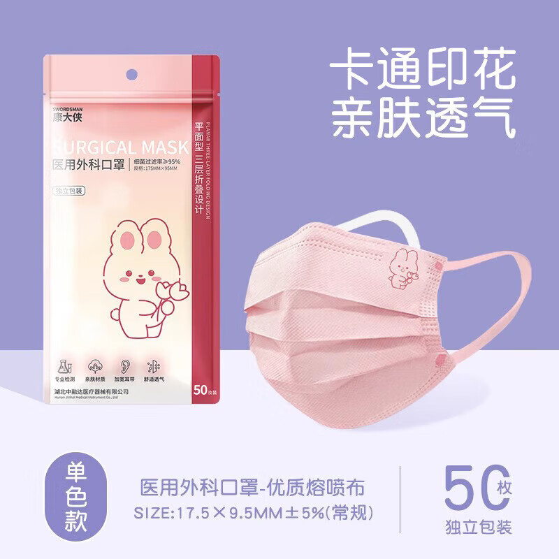 可爱粉色口罩医用外科秋冬女高颜值2025新款冬季款透气一次性 医用外科【粉小兔】50只独立装
