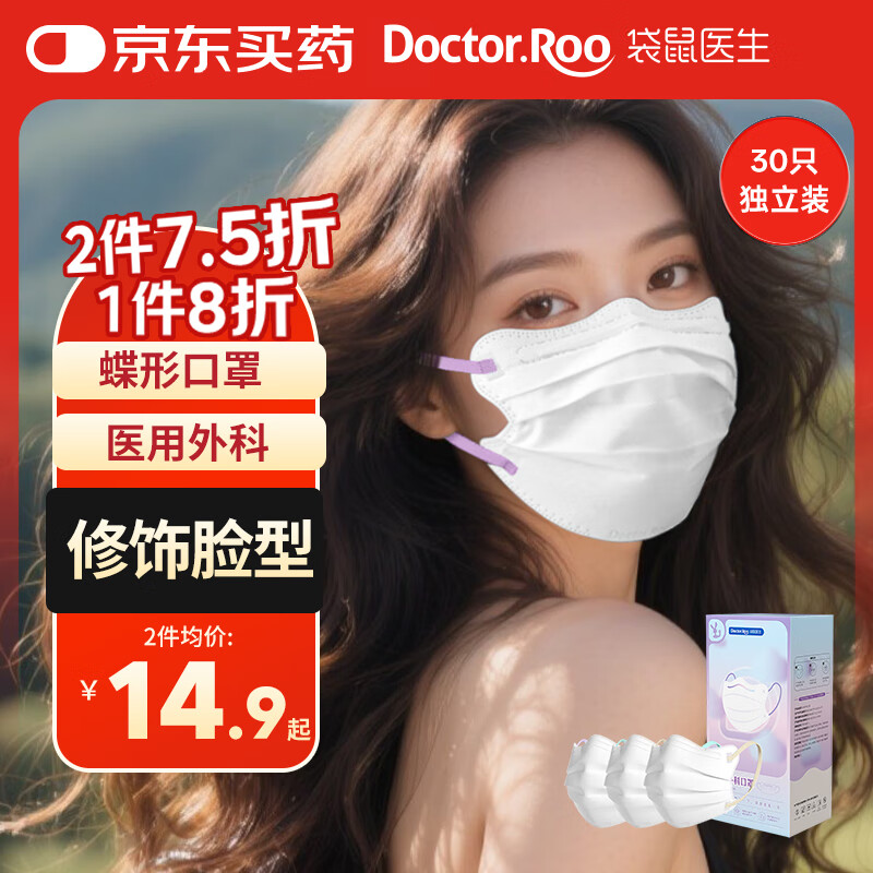 袋鼠医生一次性医用外科口罩蝶形白色高颜值防晒防尘透气秋冬独立包装30只
