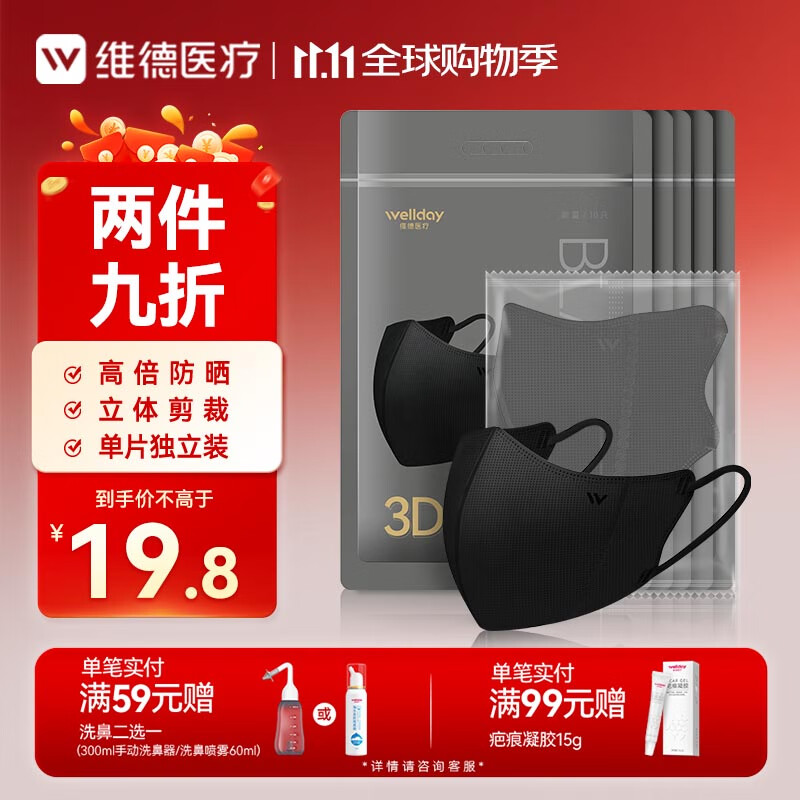 维德(WELLDAY)3D立体防晒口罩UPF50+ 男女黑色口罩防沙尘透气挂耳式10只*5袋