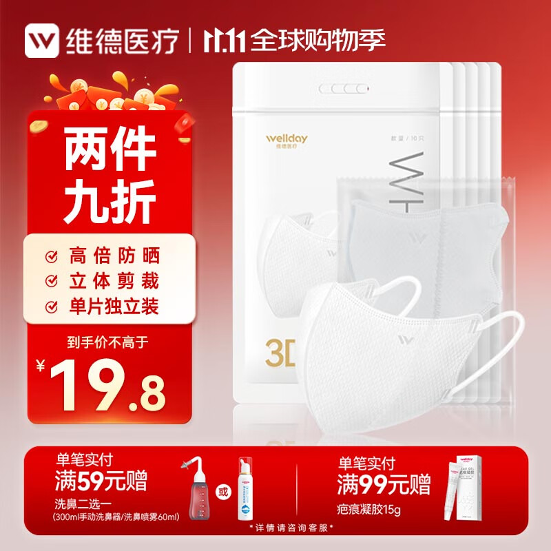 维德(WELLDAY)3D立体防晒口罩UPF50+50只男女款白色口罩时尚防沙尘暴透气独立装