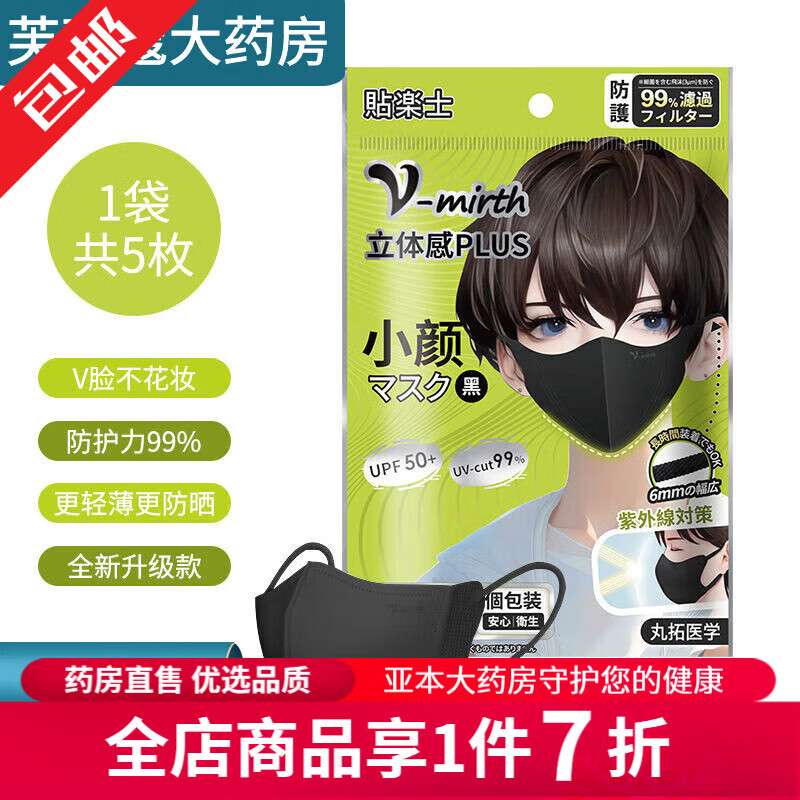 口罩高颜值防晒贴乐士小颜口罩3D立体高颜值一次性防护口罩宽耳带 [防晒修脸显瘦]黑色5枚独立包装