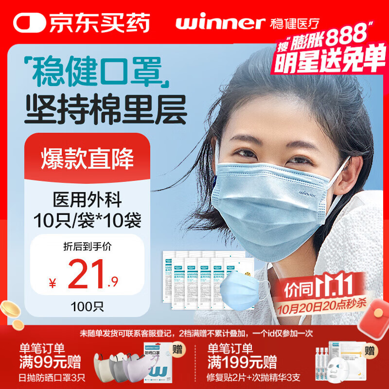 稳健一次性医用外科口罩100只独立装棉里层亲肤透气防过敏防尘防晒