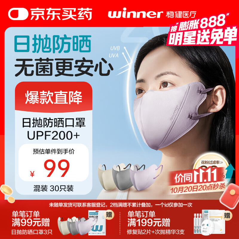 稳健一次性口罩灭菌级UPF200+防紫外线棉里层次抛防晒30混色