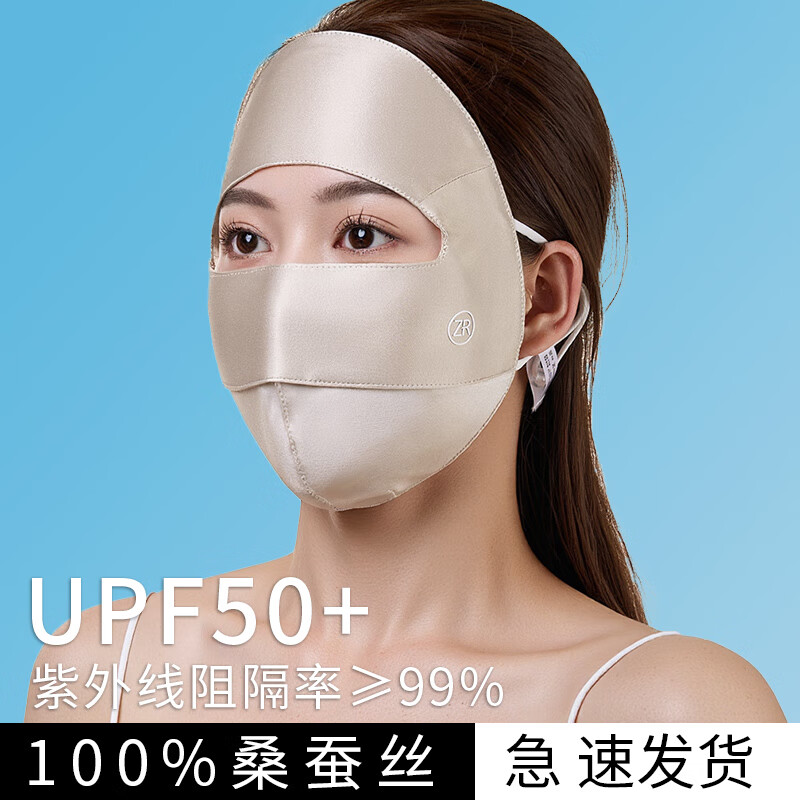 朱尔真丝防晒面罩100%桑蚕丝遮全脸面罩脸基尼防紫外线口罩女 香槟色