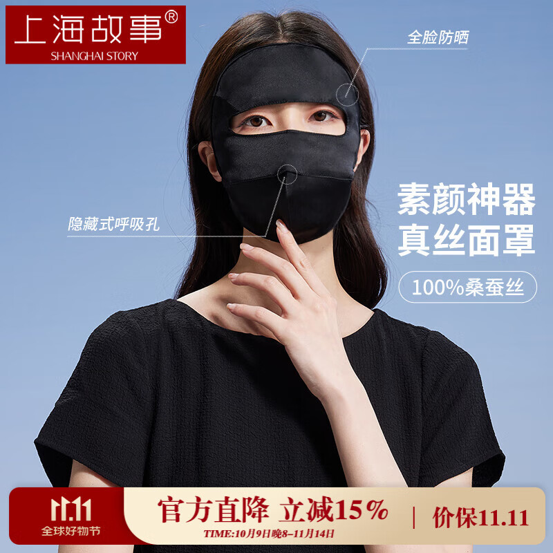 上海故事女真丝面罩防晒100%桑蚕丝遮全脸口罩夏防紫外线医美脸基尼 黑色
