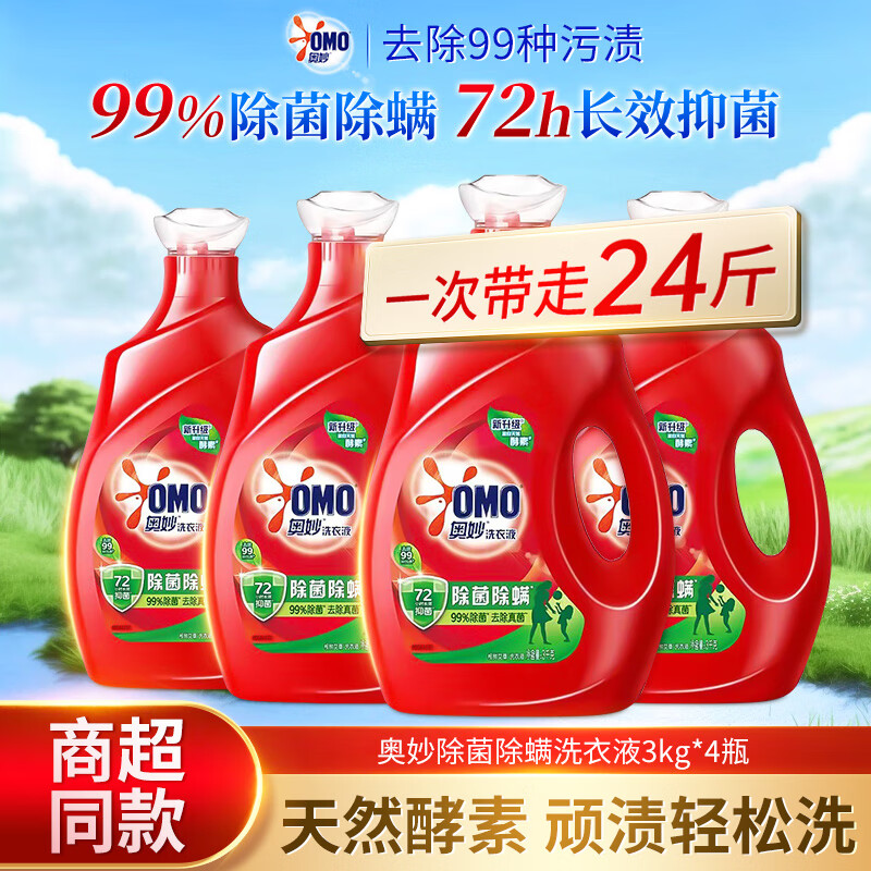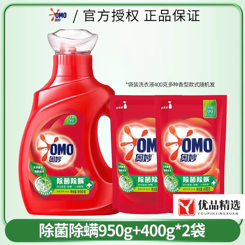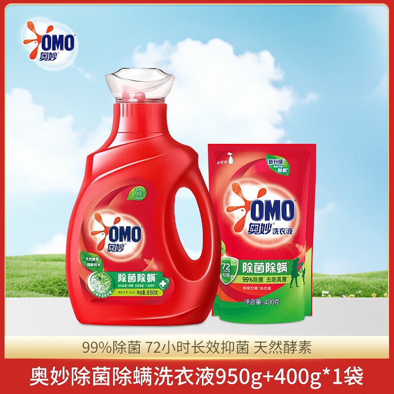 奥妙(OMO)洗衣液整箱批家用实惠装持久留香杀螨除菌补充袋装官方 共约4斤除菌除螨950g瓶+送400g*