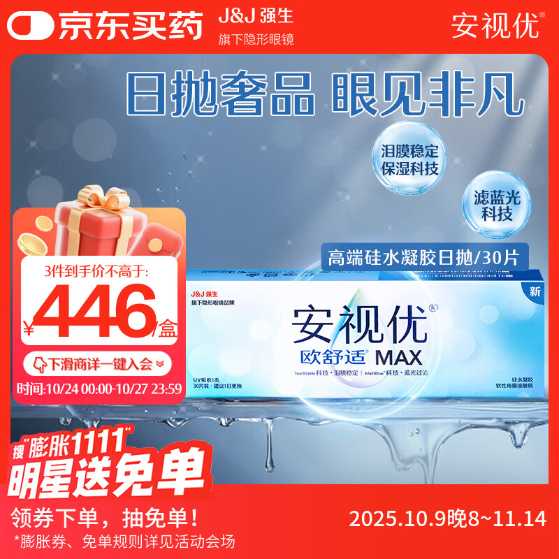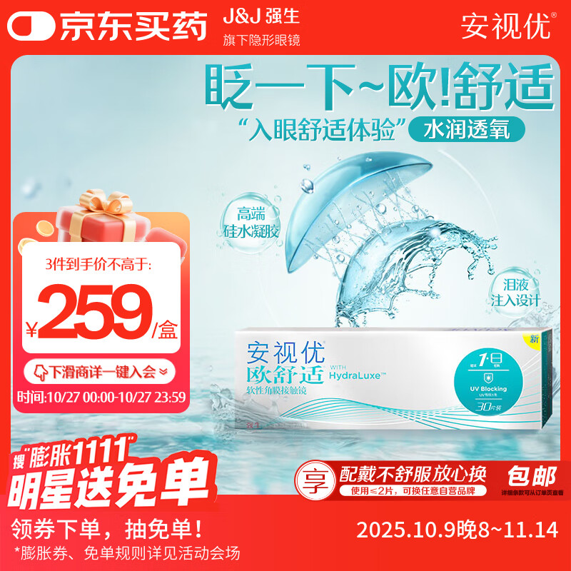 强生隐形眼镜 安视优 欧舒适 保湿近视隐形眼镜 硅水凝胶日抛30片装 欧舒适日抛30片装 1100度