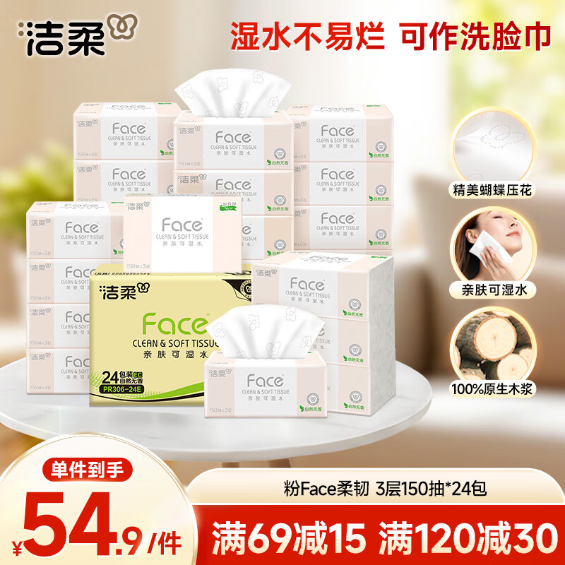 粉Face柔韧3层150抽*24包 S码 可湿水不易破卫生纸 整箱纸巾